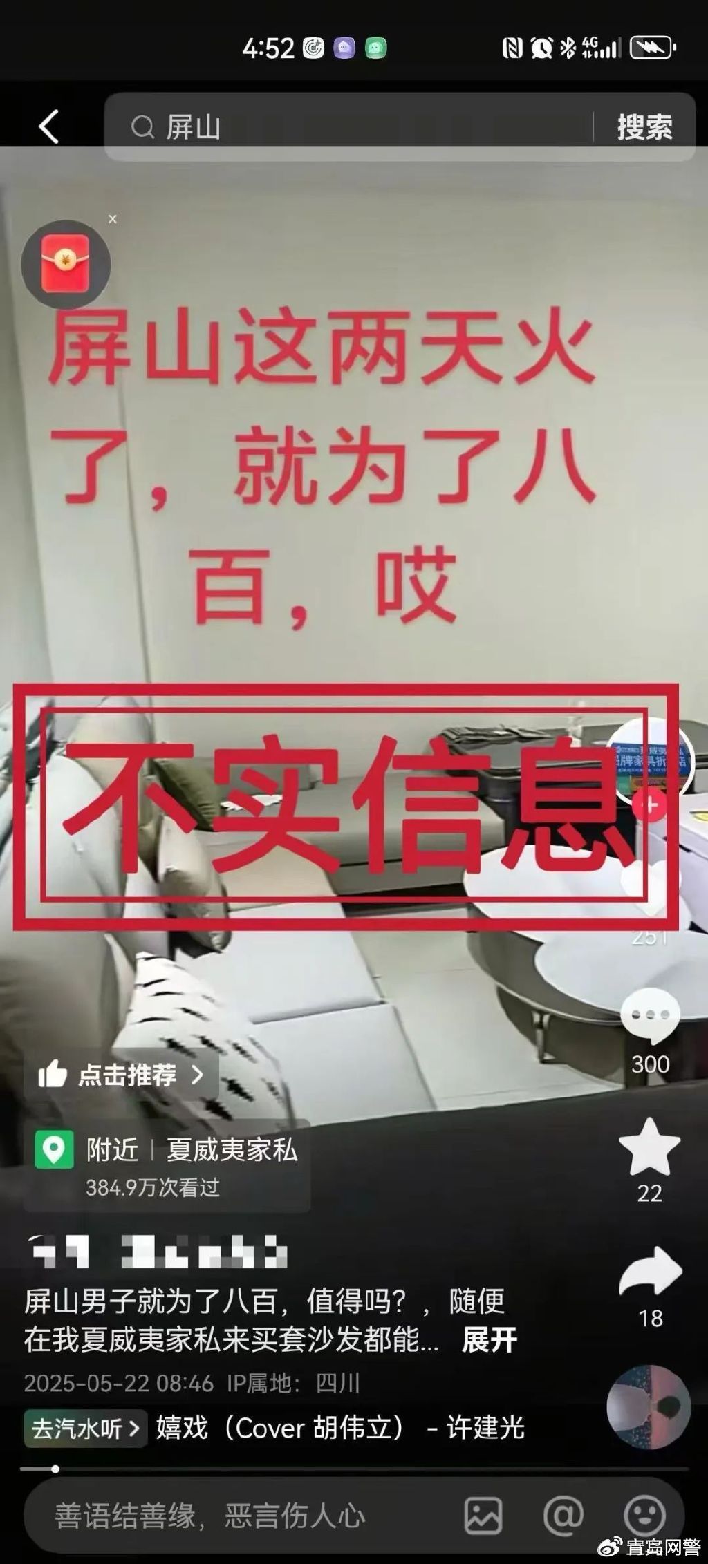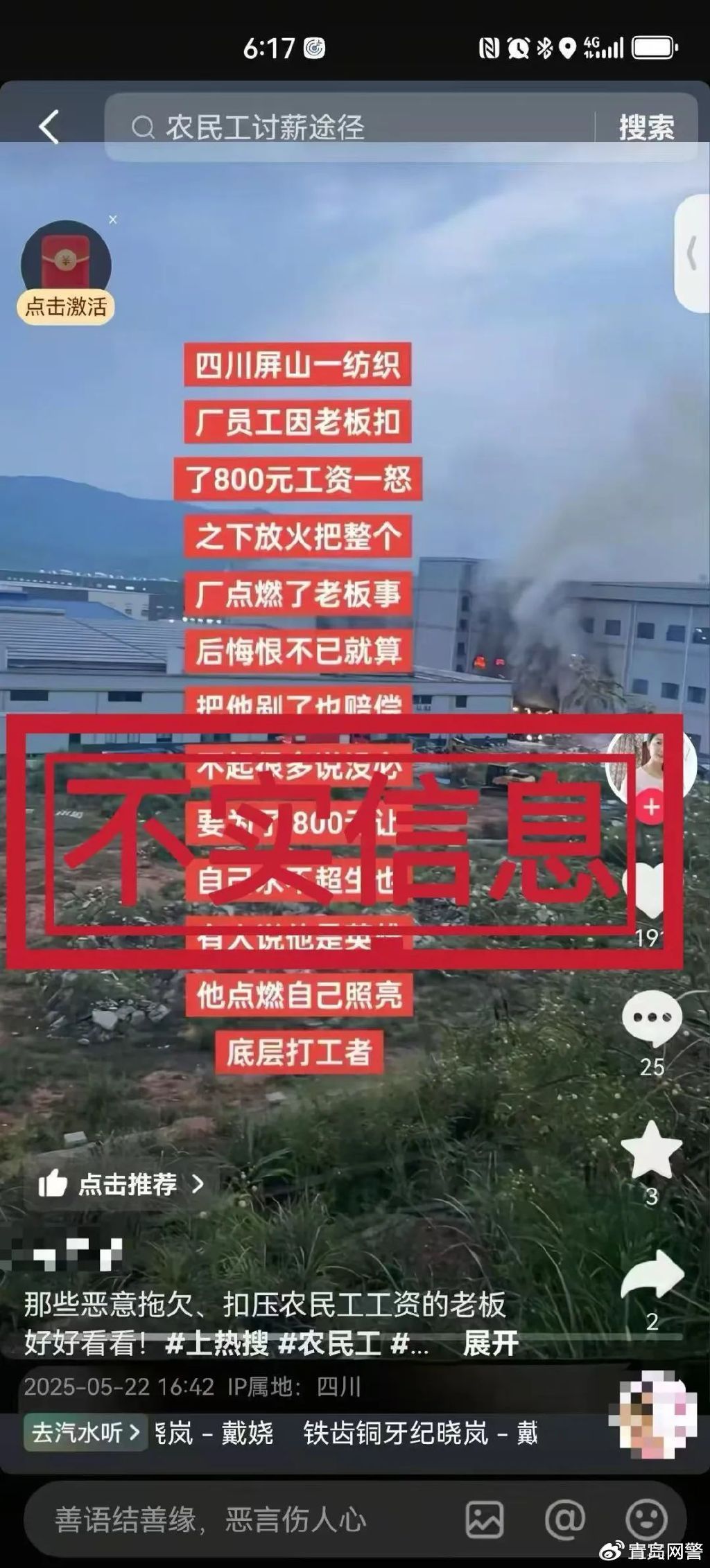 2025年5月20日,高新区网民罗某某(男,55岁)在短视频网络平台发布信息称:“四川屏山一纺织厂员工因800元工资讨要几次未果,被打了一顿后放火把整个厂烧了”,引发网民关注和议论。经核查,罗某某为趁炒热点、吸粉引流,编造了“因800元工资讨要未果并被打后纵火烧厂”的谣言信息,造成不良社会影响。罗某某对其违法行为供认不讳,四川警方已依法对罗某某进行教育训诫,本人向公安机关写出承诺书并发布致歉声明 。