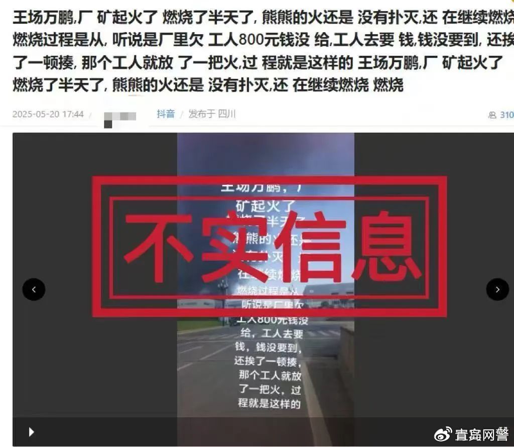 信网5月27日讯 近日,网传四川某地“一男子为了800元放火点燃工厂”,当地警方对网传信息调查,发布警情通报,证实为网传内容为谣言。