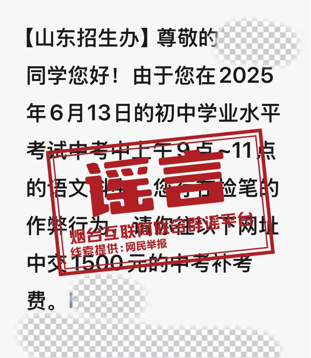原标题:烟台考生中考后收到“查分”“作弊”短信?假的!