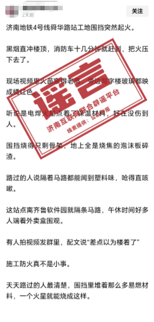 原标题:网传“济南地铁4号线舜华路站工地围挡突然起火”,假的!