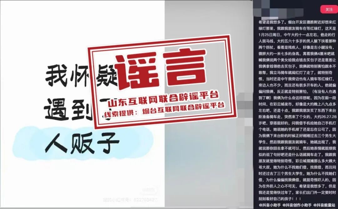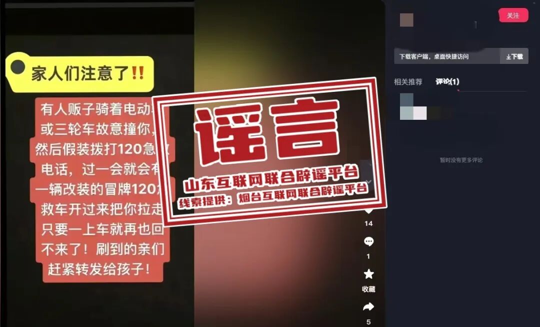 近日,网上多个短视频平台有网民发布“烟台市某商场有陌生人给他人孩子录像”“有人贩子骑着电动车或三轮车故意撞人,假装拨打120急救后,冒牌120急救车会把人拉走”等信息,引发舆论关注。