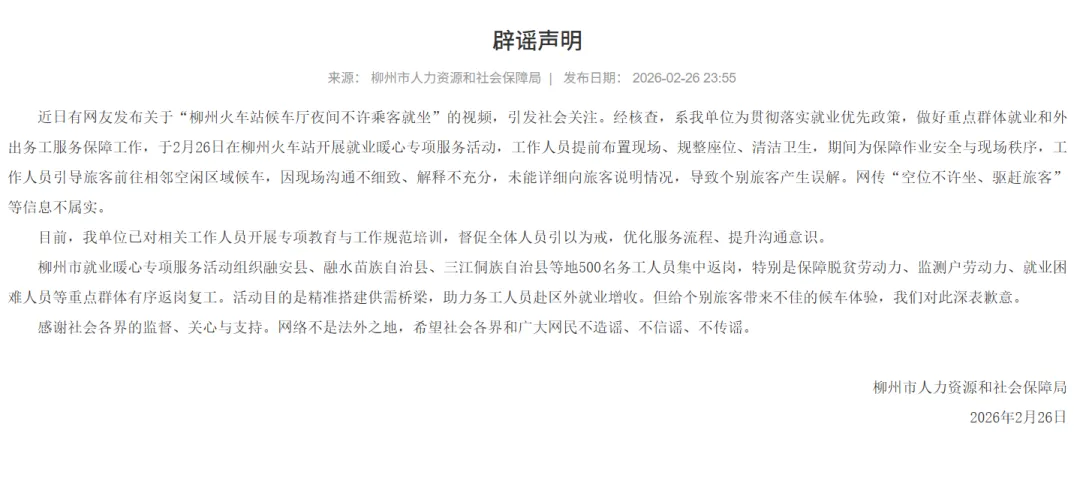 2月26日,柳州市人力资源和社会保障局通过官方网站发布辟谣声明称,当日,该局为贯彻落实就业优先政策,做好重点群体就业和外出务工服务保障工作,在柳州火车站开展就业暖心专项服务活动。工作人员需要提前布置现场、规整座位、清洁卫生等,故引导旅客前往相邻空闲区域候车,因现场沟通不细致、解释不充分,导致个别旅客产生误解。网传“空位不许坐、驱赶旅客”等信息不属实。