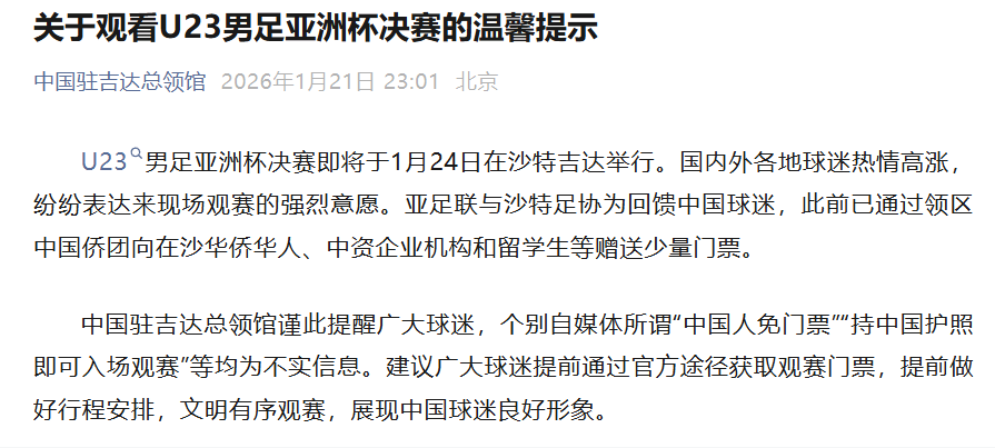 中国驻吉达总领馆:U23亚洲杯决赛“中国人免票”为不实信息