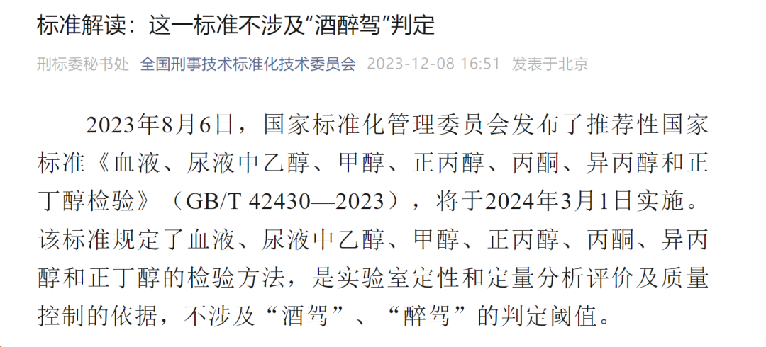 全国刑事技术标准化技术委员会对此做出标准解读,表示这一标准不涉及“酒醉驾”判定。该标准规定了血液、尿液中乙醇、甲醇、正丙醇、丙酮、异丙醇和正丁醇的检验方法,是实验室定性和定量分析评价及质量控制的依据,不涉及“酒驾”、“醉驾”的判定阈值。