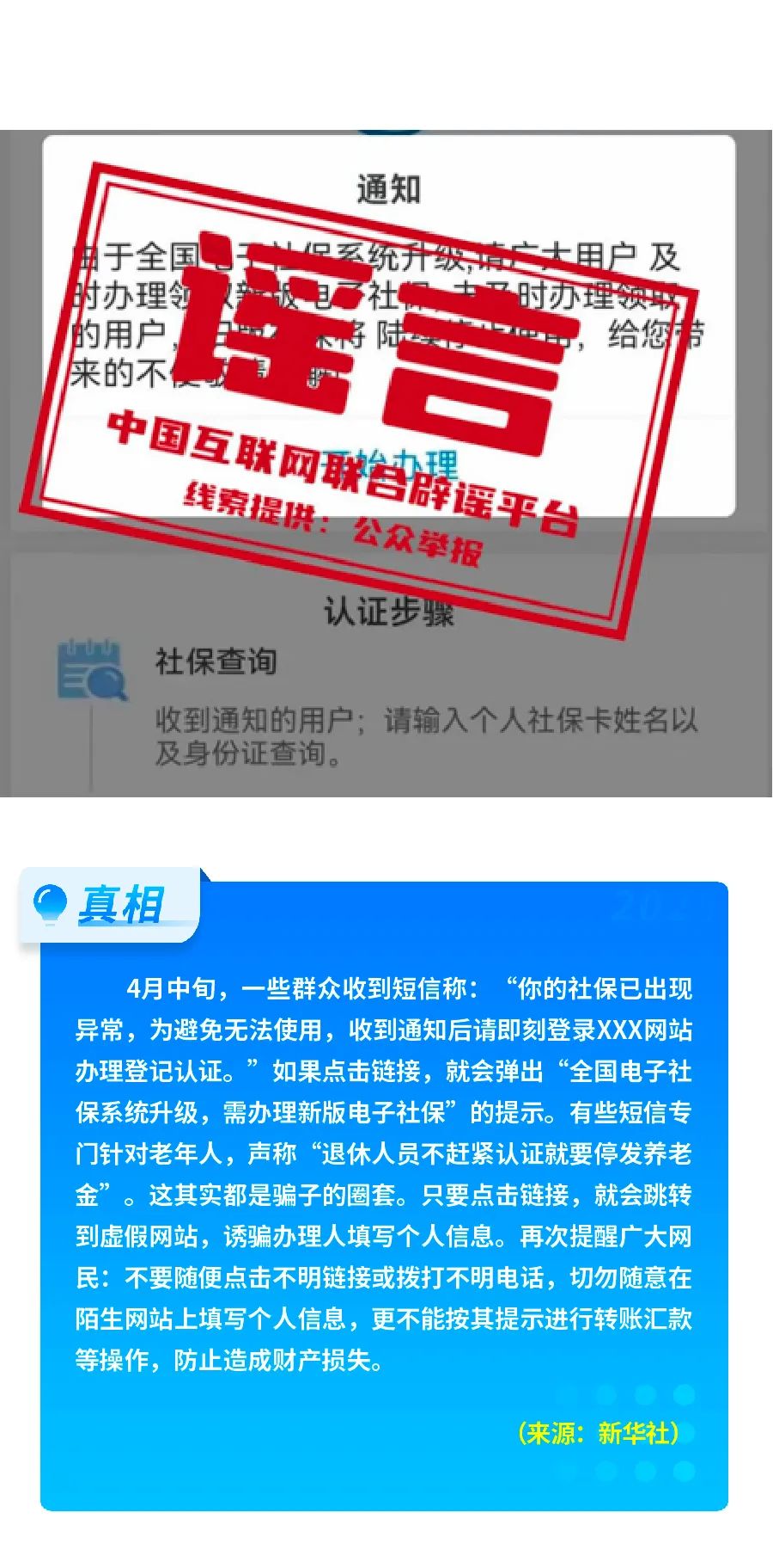 谣言四 短信提示社保账号状态“异常”需速办登记认证?